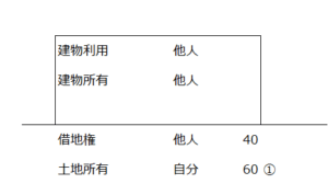 | ① | 貸宅地 | 自分 | 第三者A | 第三者A | 自用地*(1-借地権割合) | 60 | 100 | 合計が自用地価額 | 25(1) |
