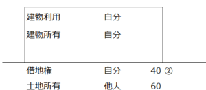 | ② | 借地権 | 第三者A | 自分 | 自分 | 自用地*借地権割合=借地権 | 40 | 27 | ||