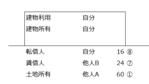 | ⑧ | 転借権 | 借地の借地 | 自分 | 自分 | 借地権*借地権割合 | 16 | 30 | ||
