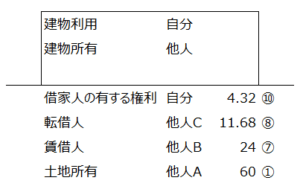 | ⑩ | 借家人の有する権利 | 第三者 | 第三者 | 自分 | 転借権価額*借家権割合*賃貸割合 | 4.32 | 31(2) |